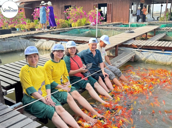 - Hau River Fish Rafts: Over 30 rafts of various sizes forming a nearly 1km-long chain. You will see numerous species like Basa fish, Fire eels, and Giant barbs, with the main highlight being the Bronze Featherback fish.
