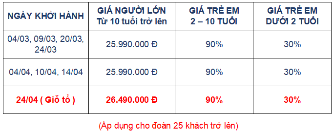 Chi phí có thể thay đổi nếu tỷ giá ngoại tệ tăng giảm đột biến (Giá vé máy bay, thuế liên quan, tỷ giá bán ra của ngân hàng Vietcombank tại thời điểm khởi hành)