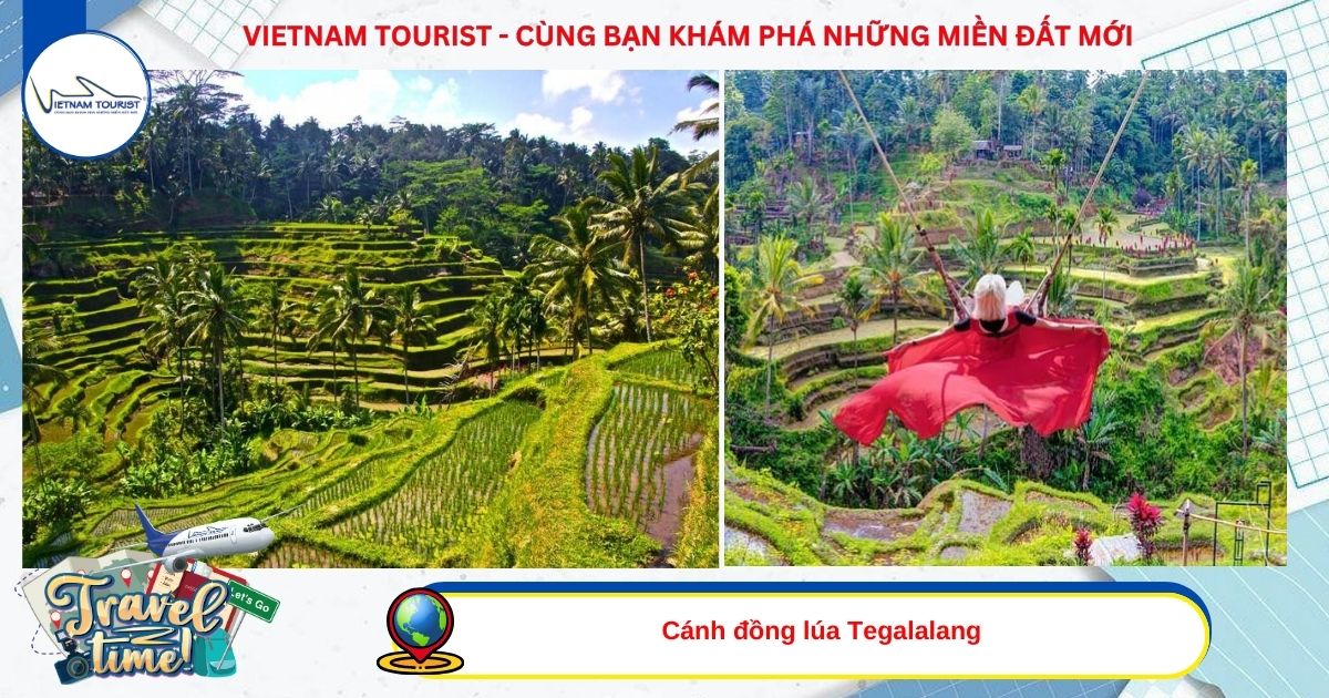 Chiều: Quý khách tham quan Cánh đồng lúa Tegalalang: chiêm ngưỡng vẻ đẹp của cánh đồng xanh mát, nằm trong một thung lũng gần Ubud, thời điểm lý tưởng nhất để bạn chiêm ngưỡng trọn vẹn vẻ đẹp của Tegalalang là vào sáng sớm hoặc lúc hoàng hôn.