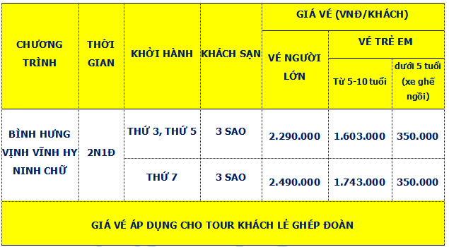 Lịch trình chi tiết tour TOUR BÌNH HƯNG - VĨNH HY - NINH CHỮ 2 NGÀY 1 ĐÊM