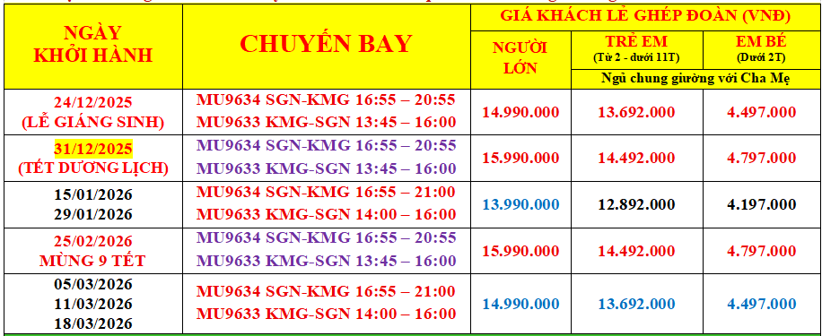 Trưởng đoàn đón Quý khách tại sân bay Tân Sơn Nhất để làm thủ tục khởi hành đi Côn Minh trên chuyến bay MU9634 SGN-KMG.