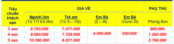 Từ dưới 02 tuổi: Tính phí phụ thu của hãng hàng không + dịch vụ tour miễn phí (bé sử dụng chung dịch vụ với ba mẹ, nếu phát sinh chi phí gia đình tự chi trả)