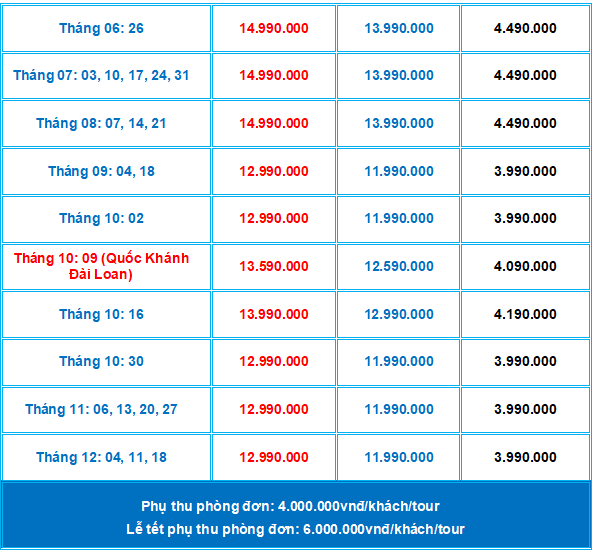 Lịch trình chi tiết tour TOUR ĐÀI LOAN - ĐÀI BẮC - ĐÀI TRUNG - CAO HÙNG 5N4Đ
