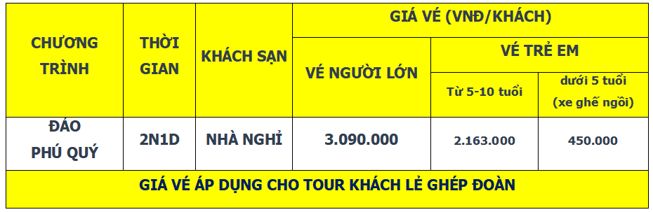 Từ dưới 05 tuổi: Miễn phí, hai người lớn chỉ kèm 1 trẻ em dưới 5 tuổi, trẻ em thứ 2 trở lên phải mua 1/2 vé tour.