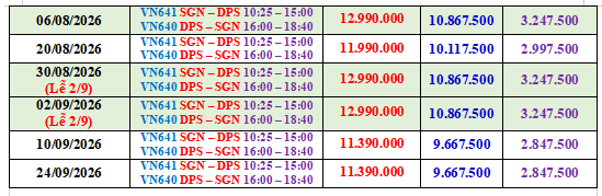 VN640 DPS – SGN lúc 16:00 – 18:40 Ăn trưa nhà hàng, ăn chiều trên máy bay
