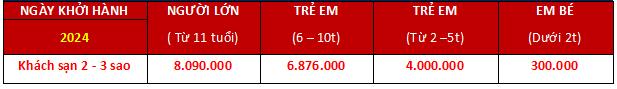 Trẻ em dưới 2 tuổi: Phụ phí máy bay 300.000. Các dịch vụ trong tour khác miễn phí, sử dụng chung dịch vụ với cha mẹ. Cha mẹ lo toàn bộ chi phí cho bé nếu có phát sinh. 02 người lớn chỉ được kèm 01 trẻ em, trẻ thứ 02 trả 30% mức phí người lớn.