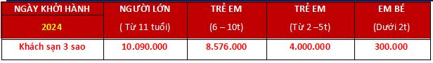 Trẻ em dưới 2 tuổi: Phụ phí máy bay 300.000. Các dịch vụ trong tour khác miễn phí, sử dụng chung dịch vụ với cha mẹ. Cha mẹ lo toàn bộ chi phí cho bé nếu có phát sinh. 02 người lớn chỉ được kèm 01 trẻ em, trẻ thứ 02 trả 30% mức phí người lớn.