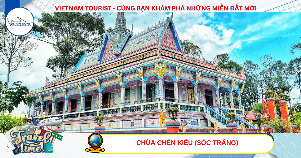 10h00 : Quý khách đến Chùa Chén Kiểu (Chùa Sà Lôn) – Sóc Trăng.Ngôi chùa gây ấn tượng mạnh bởi kiến trúc độc đáo, được trang trí từ hàng chục nghìn mảnh chén, đĩa sứ nhiều màu sắc.Mỗi hoa văn là một câu chuyện về sự bền bỉ và lòng thành kính của phật tử địa phương.
