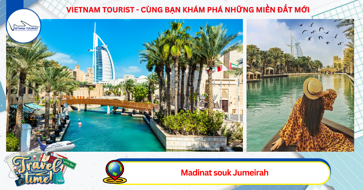 Madinat souk Jumeirah - Check-in từ xa khách sạn 7 sao nổi tiếng Thế giới Burj Al Arab Nơi đây nằm trong khu quần thể khách sạn và giải trí đồ sộ, sang trọng. nhờ có những con kênh nhỏ nhắn, duyên dáng chạy khắp khu vực nên nơi đây còn được mệnh danh là “Venice thu nhỏ” của sa mạc.