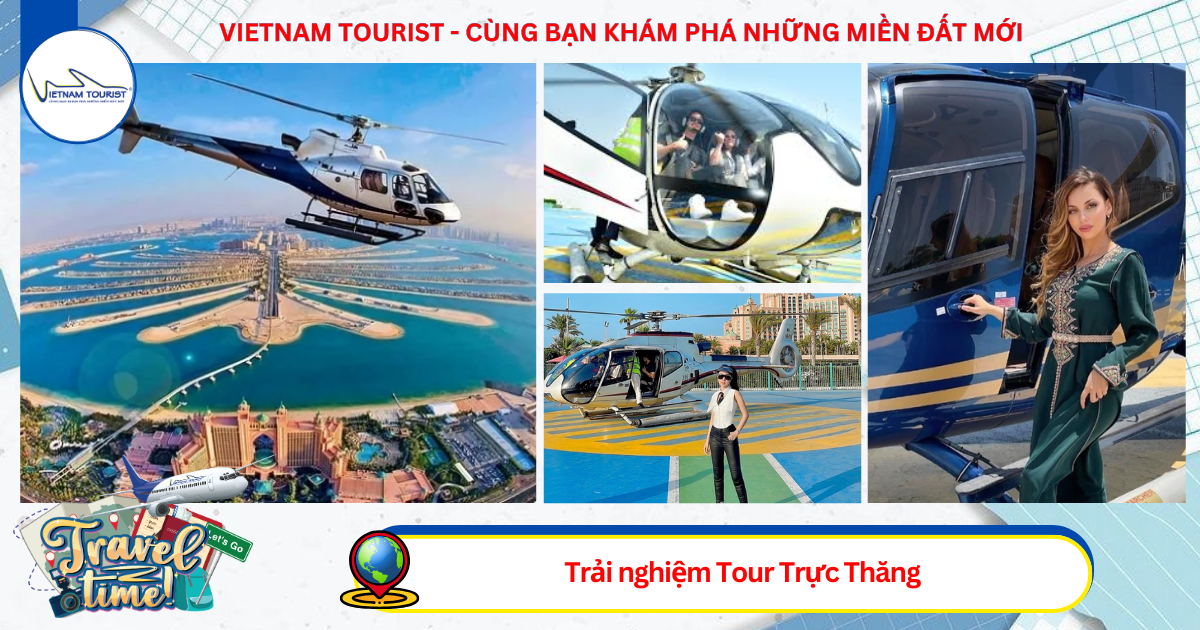 Tour trực thăng: Tận hưởng khung cảnh ngoạn mục của Dubai trên trực thăng sang trọng. Một chuyến du ngoạn tự do trên bầu trời, chiêm ngưỡng những công trình danh tiếng lần lượt hiện ra trong tầm mắt với khoảng thời gian 12-22 phút.
