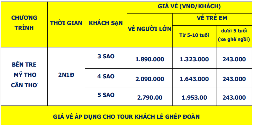 - Trẻ em dưới 5 tuổi: Cha, mẹ hoặc người thân đi kèm tự lo các chi phí ăn, ngủ, tham quan (nếu có) cho bé. Hai người lớn chỉ kèm 1 trẻ em dưới 5 tuổi, Bé thứ 2 trở đi phải mua ½ vé tour.