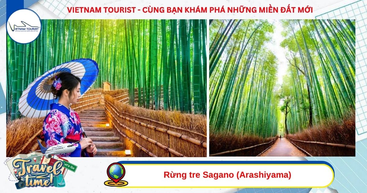 Rừng tre Sagano (Arashiyama): Con đường tre xanh mướt nổi tiếng của Kyoto, nơi mỗi bước chân đều như đưa quý khách chậm lại giữa không gian tĩnh lặng và trong lành. Ánh sáng len qua rặng tre cao vút, tiếng gió rì rào tạo nên một khung cảnh vừa nên thơ vừa kỳ diệu. Ghé Sagano, du khách sẽ được “nạp năng lượng” từ thiên nhiên, tạm gác lại sự náo nhiệt để tận hưởng cảm giác an yên rất đặc trưng của Kyoto.