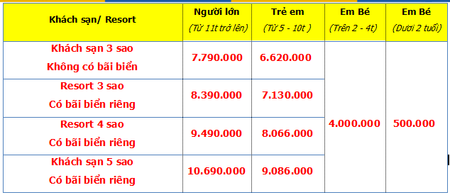 2.Khách sạn: 3 - 5 sao, đầy đủ tiện nghi, có hồ bơi, bãi biển riêng. Tiêu chuẩn 2-3-4 khách/ phòng.