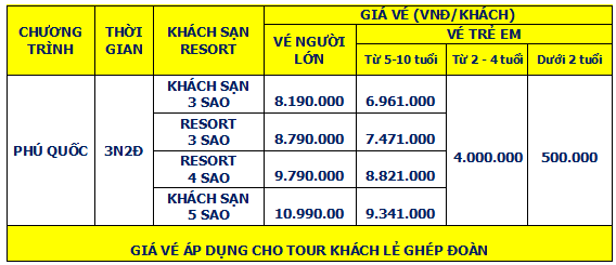 Lịch trình chi tiết tour TOUR PHÚ QUỐC 3N2Đ - ĐI BẰNG MÁY BAY