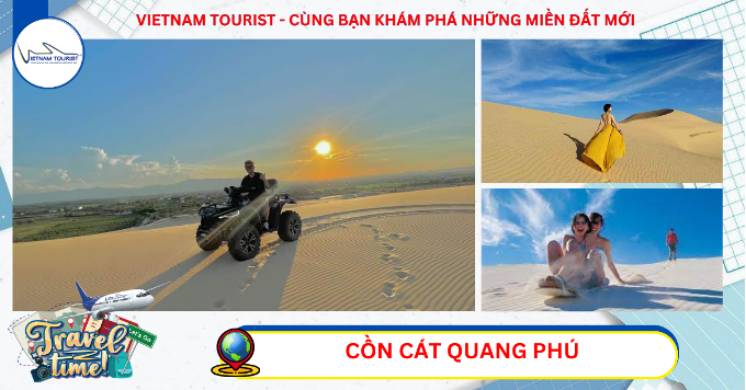05h00: Đoàn đến Cồn Cát Quang Phú. Tại đây, những ngọn núi cát trắng mịn, cao và rộng mênh mông sẽ mang lại cho du khách cảm giác như lạc vào một sa mạc và chụp những bức hình cực “chất” tại điểm đến này. Bầu trời cao trong xanh kèm theo những triền cát rộng và dài thênh thang – đây là khung cảnh lý tưởng để ra đời những bức ảnh tuyệt đẹp. Ngoài ra với những ai yêu thích cảm giác mạnh có thể trượt cát hoặc đi xe địa hình. (Chi phí tự túc)