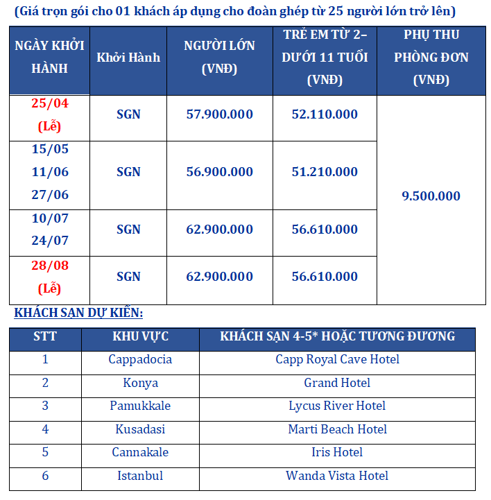 Lịch trình chi tiết tour TOUR THỔ NHĨ KỲ 10 NGÀY 9 ĐÊM - CAO CẤP
