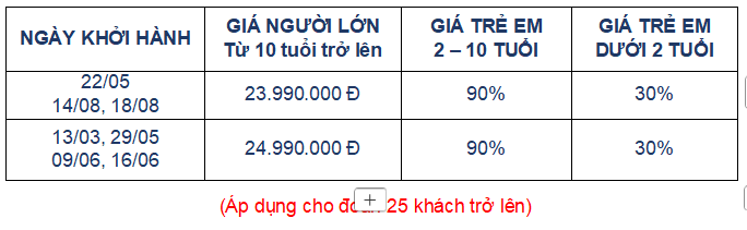 Giá áp dụng cho khách hàng từ 12 tuổi đến 69 tuổi, từ 70 tuổi trở lên sẽ đóng thêm chênh lệch cho mức phí bảo hiểm cao cấp, từ 75 tuổi trở lên yêu cầu phải có giấy chứng nhận đầy đủ sức khỏe để đi du lịch nước ngoài của cơ quan y tế có thẩm quyền cấp và phải có người thân khỏe mạnh dưới 60 tuổi đi cùng. Gia đình và quý khách phải cam kết đảm bảo tình trạng sức khỏe với Công ty chúng tôi trước khi tham gia. Nếu có bất cứ sự cố nào xảy ra trên, Công ty sẽ không chịu trách nhiệm dưới mọi tình huống.