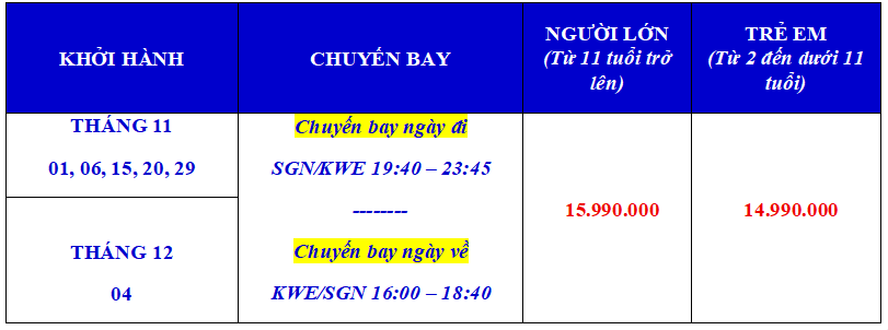 Vé máy bay khứ hồi theo cùng đoàn. Hành lý: 23kg/01 kiện hành lý ký gửi + 07 kg xách tay cho 1 khách. Phí an ninh, phí xăng dầu, thuế sân bay 2 nước.
