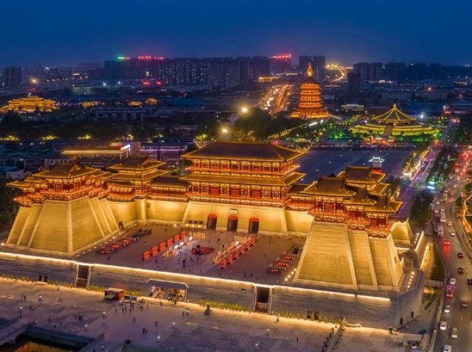 Ngoại quan Ứng Thiên Môn về đêm - được biết đến với tên gọi khác là Ngũ Phụng Lâu xây dựng vào năm 605, là một trong những cổng thành đặc biệt của thành phố Lạc Dương