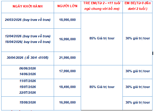 Quý khách đặt cọc tiền tour ngay khi đăng ký tour. Nộp hết tiền tour khi có kết quả visa hoặc trước ngày khởi hành 8 ngày làm việc ( tùy điều kiện nào đến trước).