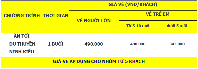 - Trẻ em dưới 5 tuổi: 70% giá vé người lớn . (Trẻ em từ 05 tuổi trở xuống, tiêu chuẩn vé ghế ngồi riêng theo quy định Luật đường thủy nội địa)