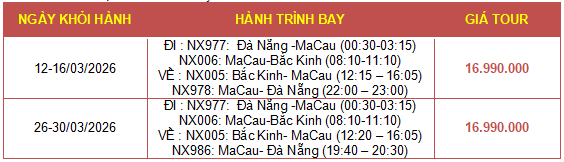 Lịch trình:ĐÀ NẴNG - BẮC KINH