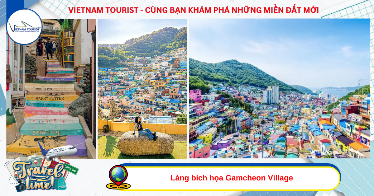 Làng bích họa Gamchoen Village - từng là một ngôi làng cổ trên đồi, nhìn hướng ra biển với những căn nhà cũ kỹ, xuống cấp. Năm 2009 ngôi làng được những nghệ sĩ phục dựng bằng những sắc màu đầy tính nghệ thuật. Ngôi làng tranh tường bắt đầu được nhiều người biết tới với những khung hình rất riêng, không lẫn đi đâu được. Gamcheon đươcc mệnh danh là Santorini của xứ Kim Chi