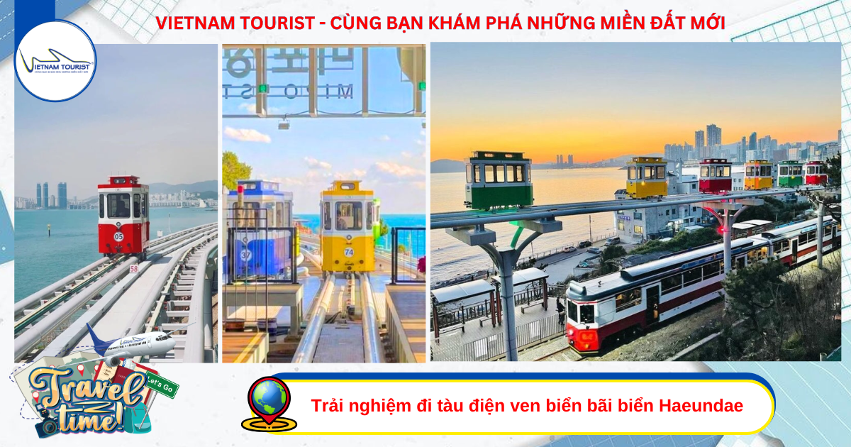 Trải nghiệm đi tàu điện ven biển bãi biển Haeundae nơi khách du lịch có thể ngắm toàn cảnh bãi biển Haeundae từ trên cao siêu đẹp Busan.