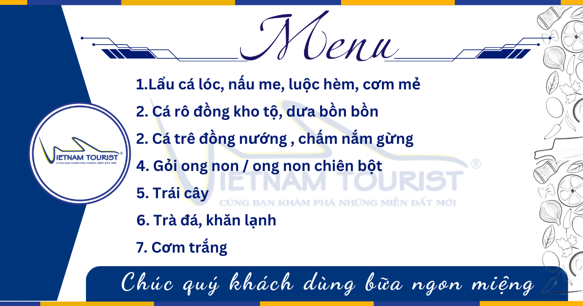 - Thưởng thức bữa trưa với các món ăn đậm chất đồng quê , ngắm nhìn khung cảnh yên bình mộc mạc của vùng sông nước.