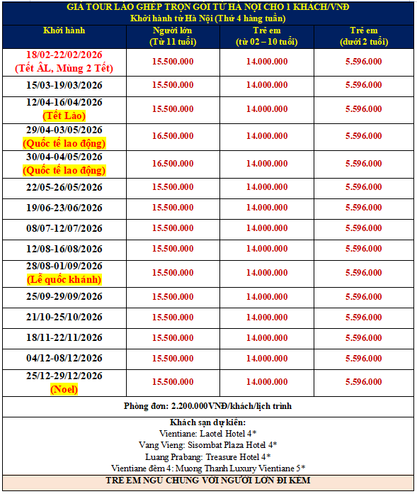 Lịch trình chi tiết tour TOUR LÀO: VIENTIANE – VANG VIENG – LUANG PRABANG 5 NGÀY 4 ĐÊM KHỞI HÀNH TỪ HÀ NỘI