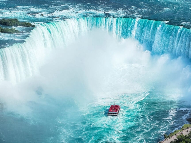 Thác Niagara bao gồm ba thác nước trên sông Niagara chảy từ Hồ Erie đến Hồ Ontario. Quý khách lên du thuyền tận hưởng cảm giác hồi hộp cực độ khi tàu đương đầu trực tiếp với ngọn thác vĩ đại này. Thác Niagara không phải là thác nước cao nhất thế giới, nhưng lại vô cùng nổi tiếng bởi vẻ đẹp của thác đến từ độ cao (176 feet ở một số đoạn) và khối lượng nước đáng kinh ngạc (hơn 700.000 gallon nước mỗi giây đổ qua thác Niagara khi dòng chảy cao điểm vào mùa hè và mùa thu). Từ dưới chân thác, du khách có thể cảm nhận sự vĩ đại của khối nước khổng lồ đổ xuống từ trên trời cao, tạo thành những đám mây sương mù với bảy sắc cầu vồng lung linh và huyền ảo... (Đi thuyền vào lòng thác sẽ được xác nhận trước khi đoàn khởi hành vì còn phụ thuộc vào lịch mở cửa của Ban Quản lý).
