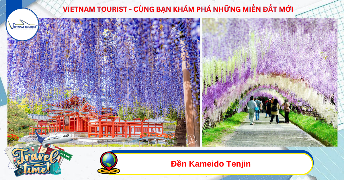 Hoặc Đền Kameido Tenjin – mỗi dịp cuối tháng 4 đến đầu tháng 5, hơn 100 cây tử đằng tại đây đồng loạt nở rộ, phủ kín các giàn hoa bằng những chùm hoa tím biếc rủ xuống duyên dáng, du khách sẽ bị cuốn hút bởi cảnh tượng hoa tử đằng soi bóng xuống mặt hồ, tạo nên một bức tranh huyền ảo, lung l inh dưới ánh nắng xuân.