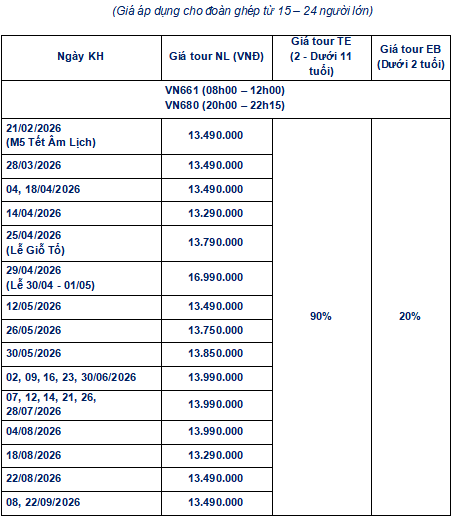 Giờ bay và hãng hàng không có thay đổi cho phù hợp với chương trình và tình trạng vé máy bay. CTDL sẽ thông báo và gửi lịch bay chính xác cho đoàn trước ngày khởi hành ít nhất 4 ngày.