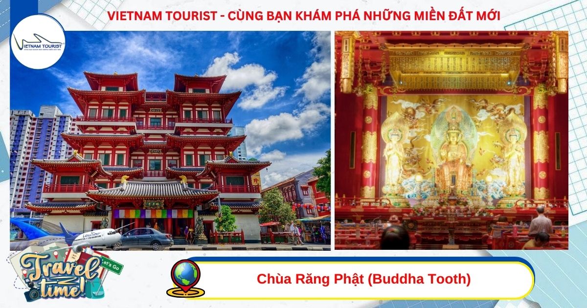 Chùa Răng Phật (Buddha Tooth) – tọa lạc giữa khu phố Chinatown giàu bản sắc. Ngôi chùa gây ấn tượng với kiến trúc tinh xảo và không gian trang nghiêm, lưu giữ xá lợi Răng Phật vô cùng linh thiêng. Bên trong còn có bảo tàng Phật giáo trưng bày hiện vật và câu chuyện lịch sử trải dài hàng ngàn năm, là điểm đến thanh tịnh – ý nghĩa – giàu giá trị văn hóa.